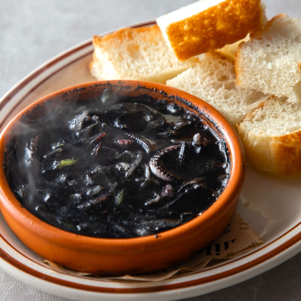 スルメイカと長ネギのイカスミアヒージョ